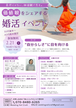 開催日:2026年02月21日(土) 名古屋市内尾張知多西三河東三河その他 男性:30代後半~40代前半 女性:30代後半~40代前半
