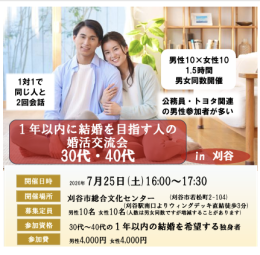 参加資格:原則、男女共30代・40代の独身者です。結婚を早くしたい人、できれば1年以内に結婚を希望している人を条件としています。 参加人数不足の場合、それ以外の年代からのご要望があれば受け付ける場合もあります。 男性:定職に就いており1年以内に結婚したい方 女性:1年以内に結婚したい方 お一人様参加歓迎! 再婚者・シングルマザーも歓迎!
