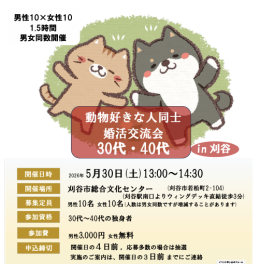 参加資格:自分の好きな動物の画像をご持参ください。 原則、男女共20代・30代の独身者です。参加人数不足の場合、それ以外の年代からのご要望があれば受け付けます。 男性:動物好き、定職に就いており結婚願望のある方 女性:動物好き、結婚願望のある方であれば特に指定はありません お一人様参加歓迎! 再婚者・シングルマザーも歓迎!