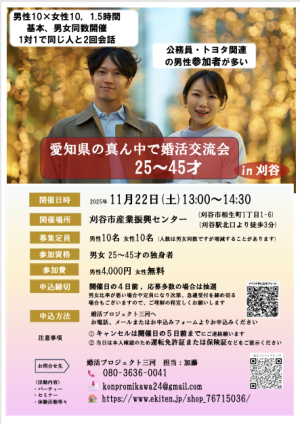 25~45才の男女各々10名を募集します。真面目な出会いの場を企画しました。1対1の対話形式で必ず全員と2回お話しできます。比較的公務員・トヨタ関連の男性が多いです。