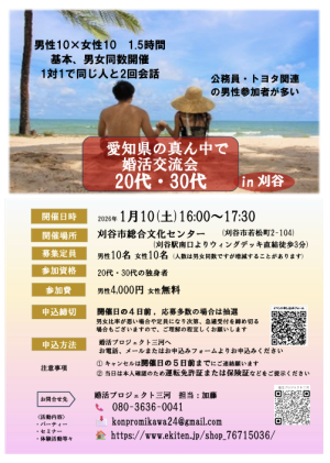 20代・30代の男女各々10名を募集します。真面目な出会いの場を企画しました。1対1の対話形式で必ず全員と2回お話しできます。比較的公務員・トヨタ関連の男性が多いです。