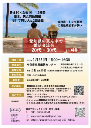 20代・30代の男女各々10名を募集します。真面目な出会いの場を企画しました。1対1の対話形式で必ず全員と2回お話しできます。比較的公務員・トヨタ関連の男性が多いです。