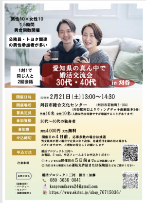 30代・40代の男女各々10名を募集します。真面目な出会いの場を企画しました。1対1の対話形式で必ず全員と2回お話しできます。比較的公務員・トヨタ関連の男性が多いです。