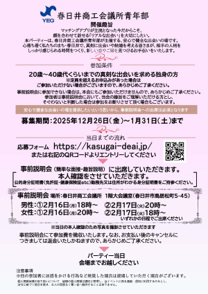 | 参加資格 | ・20~40代くらいまでの独身の男女 ・事前説明会(面接・趣旨説明)に必ず参加できる方 (応募多数の場合は、春日井市在住・在勤の方を優先とします) ※画像にある事前説明会の日程や専用HPをご確認ください |
