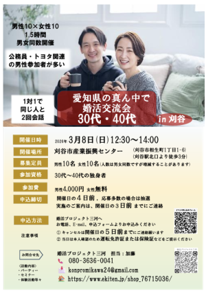 30代・40代の男女各々10名を募集します。真面目な出会いの場を企画しました。1対1の対話形式で必ず全員と2回お話しできます。比較的公務員・トヨタ関連の男性が多いです。