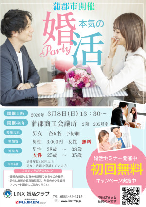 蒲郡de婚活パーティー3月8日開催 ☆25歳~38歳☆同世代 ×2年以内の結婚に真剣な方へ碧南市 幸田町 蒲郡市 安城市 岡崎市 豊橋市 豊川市から参加者多数 (主催:(株)三河湾リゾートリンクス LINX婚活クラブ)