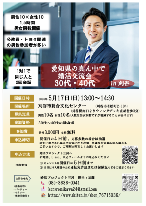 30代・40代の男女各々10名を募集します。真面目な出会いの場を企画しました。1対1の対話形式で必ず全員と2回お話しできます。比較的公務員・トヨタ関連の男性が多いです。