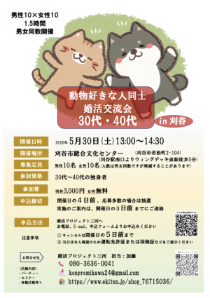 動物好きな人の婚活交流会 (30代・40代) (主催:婚活プロジェクト三河)