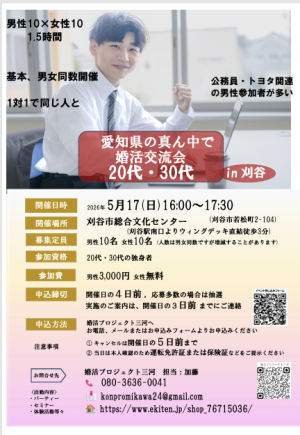 20代・30代の男女各々10名を募集します。真面目な出会いの場を企画しました。1対1の対話形式で必ず全員と2回お話しできます。比較的公務員・トヨタ関連の男性が多いです。