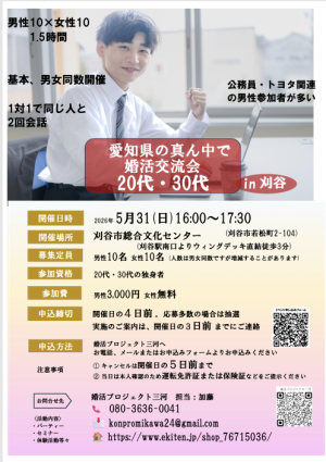 20代・30代の男女各々10名を募集します。真面目な出会いの場を企画しました。1対1の対話形式で必ず全員と2回お話しできます。比較的公務員・トヨタ関連の男性が多いです。