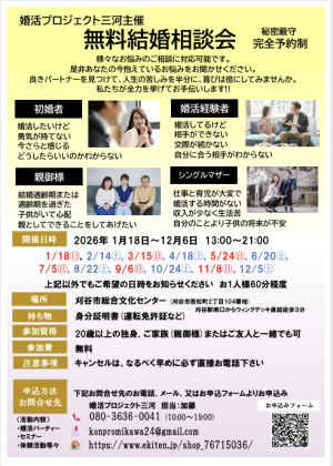 | お問い合わせ先 | 婚活プロジェクト三河 担当:加藤 電話:080-3636-0041 メール:konpromikawa24@gmail.com |