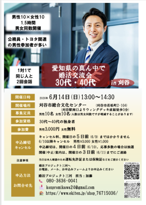 30代・40代の男女各々10名を募集します。真面目な出会いの場を企画しました。1対1の対話形式で必ず全員と2回お話しできます。比較的公務員・トヨタ関連の男性が多いです。