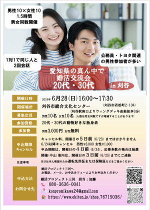 20代・30代の男女各々10名を募集します。真面目な出会いの場を企画しました。1対1の対話形式で必ず全員と2回お話しできます。比較的公務員・トヨタ関連の男性が多いです。
