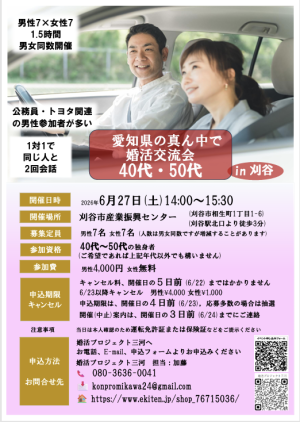 40代・50代の男女各々7名を募集します。真面目な出会いの場を企画しました。1対1の対話形式で必ず全員と2回お話しできます。比較的公務員・トヨタ関連の男性が多いです。