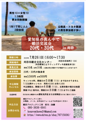 20代・30代の男女各々10名を募集します。真面目な出会いの場を企画しました。1対1の対話形式で必ず全員と2回お話しできます。比較的公務員・トヨタ関連の男性が多いです。