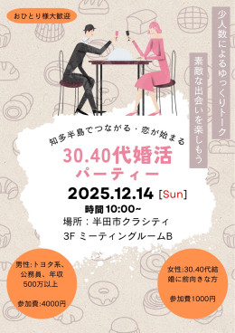 開催日:2025年12月14日(日) 名古屋市内尾張知多西三河東三河その他 男性:30代前半~30代後半 女性:30代前半~30代後半