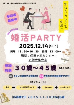 参加資格:①30歳~45歳までの独身者 ②勤労者等 ③みよし市在住または在勤の方 【男性は、みよし市在住または在勤の方限定】 【女性は、みよし市在住または在勤していなくても参加可】
