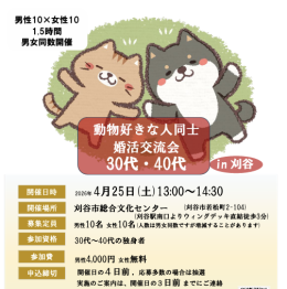 参加資格:自分の好きな動物の画像をご持参ください。 原則、男女共20代・30代の独身者です。参加人数不足の場合、それ以外の年代からのご要望があれば受け付けます。 男性:動物好き、定職に就いており結婚願望のある方 女性:動物好き、結婚願望のある方であれば特に指定はありません お一人様参加歓迎! 再婚者・シングルマザーも歓迎!