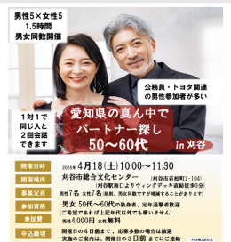 4月19日(日)13時30分~アイプラザ豊橋2F202《40代&50代メイン》旅行&お出かけが好きな二人/たくさんの思い出を重ねていきたい方 男性:旅行お出かけ好きな方/公務員又は上場企業.専門職 女性:お出かけ好きな方