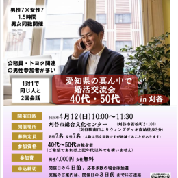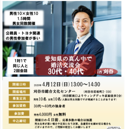 参加資格:・愛知県在住または在勤の20代後半〜40代を中心とした未婚の男女 ・結婚を前向きに考えている方 ・イベントの趣旨にご理解・ご賛同いただける方 ※先着順 ※定員に達し次第、募集を締め切る場合があります