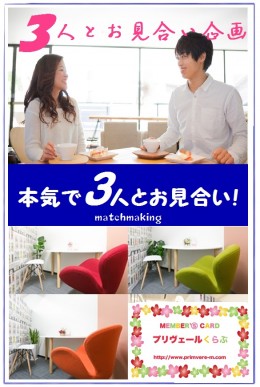 参加資格:独身男性:定職にお就きの方(26~33歳位) 独身女性:真剣に結婚をしたい方(26~33歳位)