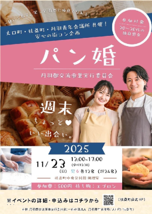 内容 | 【当日の流れ】 ①受付 ②オリエンテーション ③パン作り、食事タイム、交流など ④マッチング ※当日のスケジュール・内容は予告なく変更になることがございます。 イベントHP(扶桑町公式HP) https://www.town.fuso.lg.jp/kurashi/1003937/1004472.html |