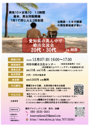 20代・30代の男女各々10名を募集します。真面目な出会いの場を企画しました。1対1の対話形式で必ず全員と2回お話しできます。比較的公務員・トヨタ関連の男性が多いです。