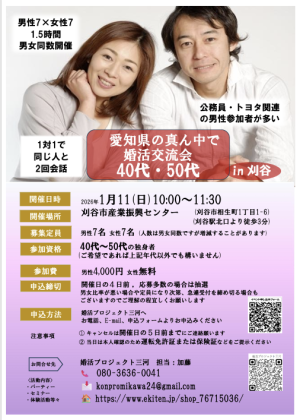 40代・50代の男女各々7名を募集します。真面目な出会いの場を企画しました。1対1の対話形式で必ず全員と2回お話しできます。比較的公務員・トヨタ関連の男性が多いです。
