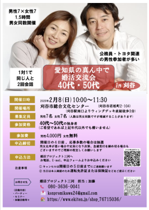 40代・50代の男女各々7名を募集します。真面目な出会いの場を企画しました。1対1の対話形式で必ず全員と2回お話しできます。比較的公務員・トヨタ関連の男性が多いです。