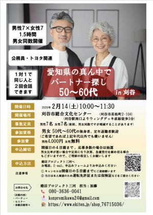 50代・60代の男女各々7名を募集します。真面目な出会いの場を企画しました。1対1の対話形式で必ず全員と2回お話しできます。比較的公務員・トヨタ関連の男性が多いです。