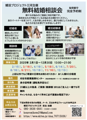 | 内容 | 婚活プロジェクト三河は、独身者に「出会い~結婚」を提供するイベントを企画・運営し、一人でも多くの人が幸せな人生を送れるよう真剣に応援、サポートしております。 毎月1回開催しますが、お客様との調整により特別に日時・場所を設けることもあります。 結婚に関するお悩みに婚活アドバイザーが個別に対応いたします。 もちろん個人情報保護方針に則り、秘密厳守ですので、安心してお申込みください。 |
