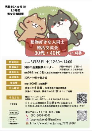 | 参加資格 | 自分の好きな動物の画像をご持参ください。 原則、男女共30代・40代の独身者です。参加人数不足の場合、それ以外の年代からのご要望があれば受け付けます。 男性:動物好き、定職に就いており結婚願望のある方 女性:動物好き、結婚願望のある方であれば特に指定はありません お一人様参加歓迎! 再婚者・シングルマザーも歓迎! |