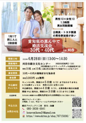 30代・40代の男女各々10名を募集します。真面目な出会いの場を企画しました。1対1の対話形式で必ず全員と2回お話しできます。比較的公務員・トヨタ関連の男性が多いです。