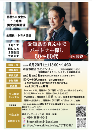50代・60代の男女各々5名を募集します。真面目な出会いの場を企画しました。1対1の対話形式で必ず全員と2回お話しできます。比較的公務員・トヨタ関連の男性が多いです。