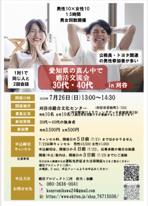 30代・40代の男女各々10名を募集します。真面目な出会いの場を企画しました。1対1の対話形式で必ず全員と2回お話しできます。比較的公務員・トヨタ関連の男性が多いです。