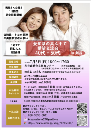 40代・50代の男女各々5名を募集します。真面目な出会いの場を企画しました。1対1の対話形式で必ず全員と2回お話しできます。比較的公務員・トヨタ関連の男性が多いです。