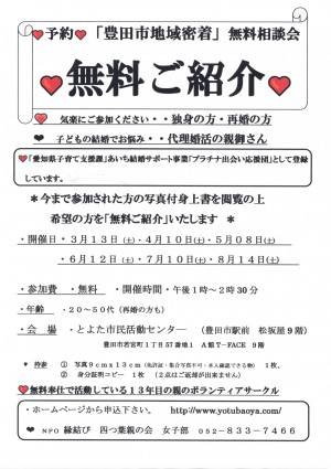 豊田4月10日❤無料紹介・無料相談・独身の方・親御さんのお悩み結婚相談会 (主催:NPO縁結び四つ葉親の会)