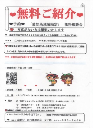 【無料紹介】愛知県地域 真剣な無料相談会(独身者・親御さん)婚活お悩み解消いたします 【秘密厳守】いたしますので気楽にお出で下さい10月15日」 (主催:NPO縁結び四つ葉親の会)